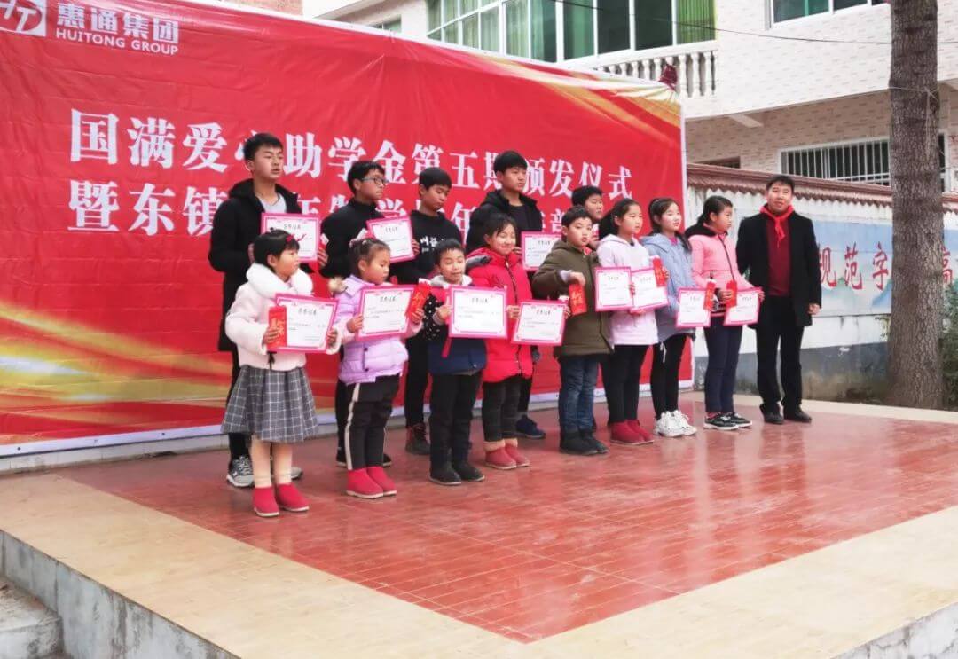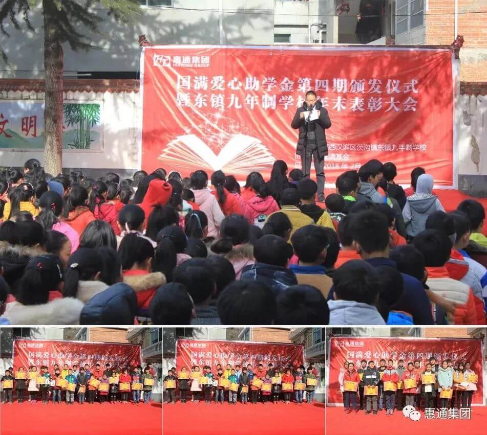 惠通集团在陕西汉滨区茨沟镇东镇九年制学校发起第五届”国满爱心助学基金”公益助学活动,51名学生获得奖励及资助,到今天,”国满爱心助学基金”已顺利进行了五届,5年来共资助学生三百多名。